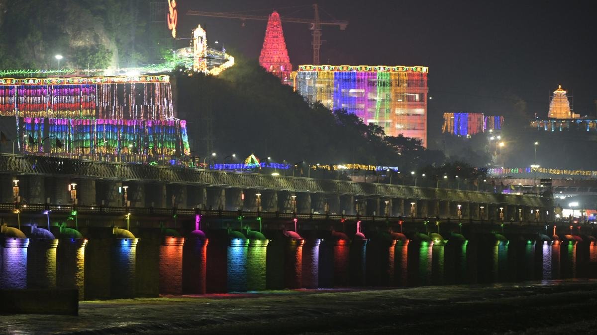 The Kanaka Durga temple atop Indrakeeladri decorated with illumination on the third day of Dasara festival, in Vijayawada on Saturday.