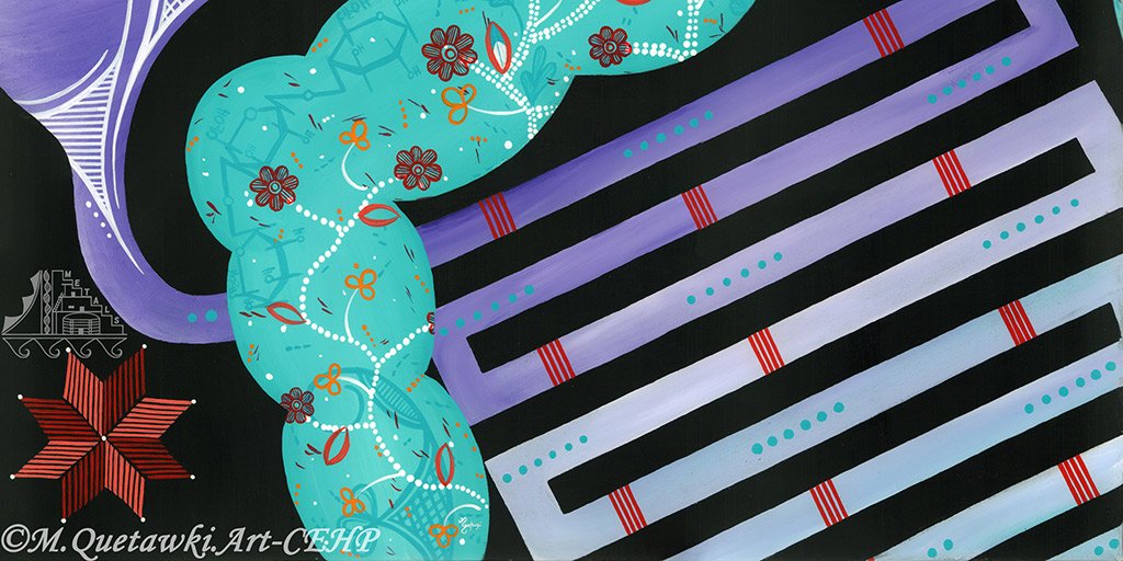 This image depicts how environmental contaminants cause damage to a strand of DNA. Background designs near edges of painting represent Pendleton blankets that are used in gift giving, trading, and traditional ceremonies. (Image courtesy of Mallery Quetawki)She also developed paintings for participants in the Thinking Zinc clinical trial, which evaluates whether dietary zinc supplements can protect against metal exposure. Her painting compares DNA repair, aided by zinc, to the creation of beaded items in Native American culture.