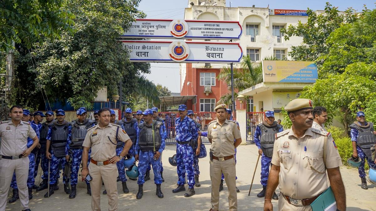 Security personnel stand guard outside Bawana police station, where climate activist Sonam Wangchuk is being held after he was detained by Delhi Police during his ‘Dilli Chalo Padyatra’, in New Delhi, on October 1, 2024.