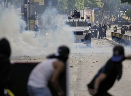 Protesters clash with police during demonstrations against the official election results declaring President Nicolas Maduro’s reelection, the day after the vote in Caracas, Venezuela, on
